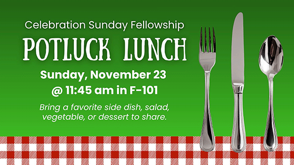 Following the Celebration Sunday worship service on November 23, we invite you to join your Northway friends in Fellowship Hall for an all-church fellowship potluck lunch. Bring a favorite side dish, veggie, salad, or dessert to share.
