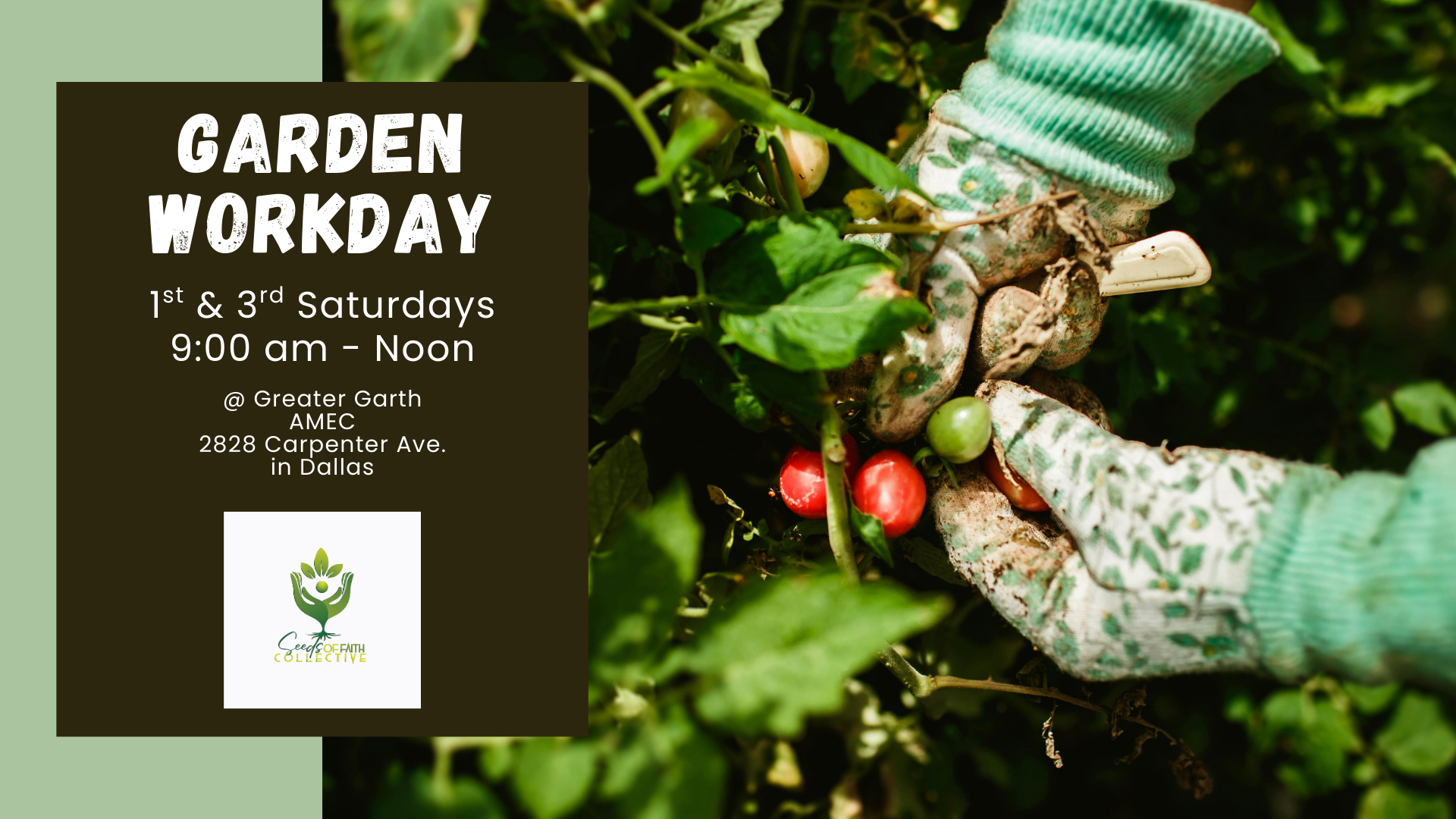 Join us for a garden workday on the 1st and 3rd Saturdays of each month, from 9:00 am until noon. Come when you can, stay as long as you want. The community garden is located at Greater Garth Chapel AME at 2828 Carpenter Ave, Dallas, TX 75215. All ages welcome!