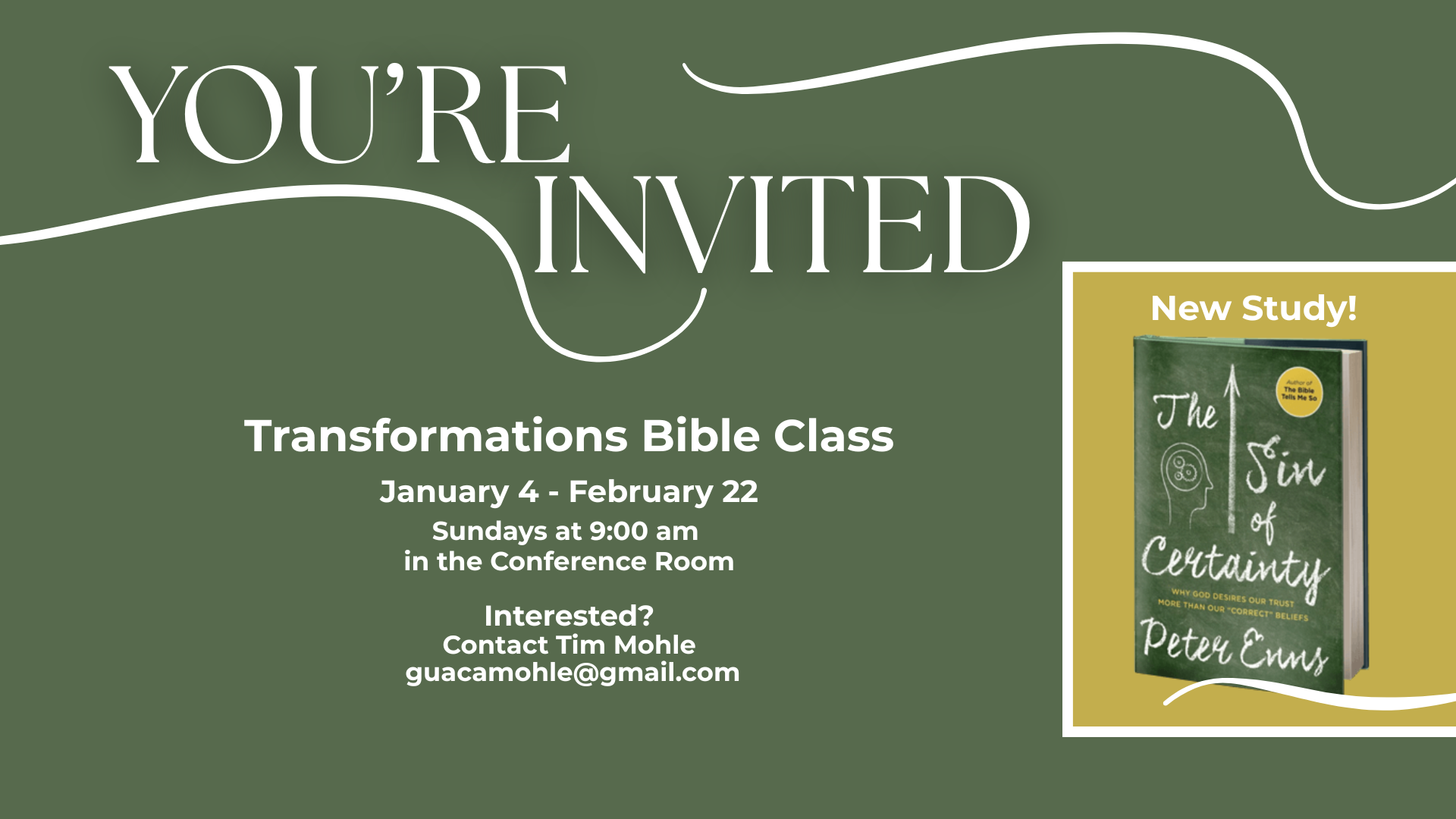 The Transformations Bible Class invites you to join them in their new study of Peter Enns book, The Sin of Certainty.